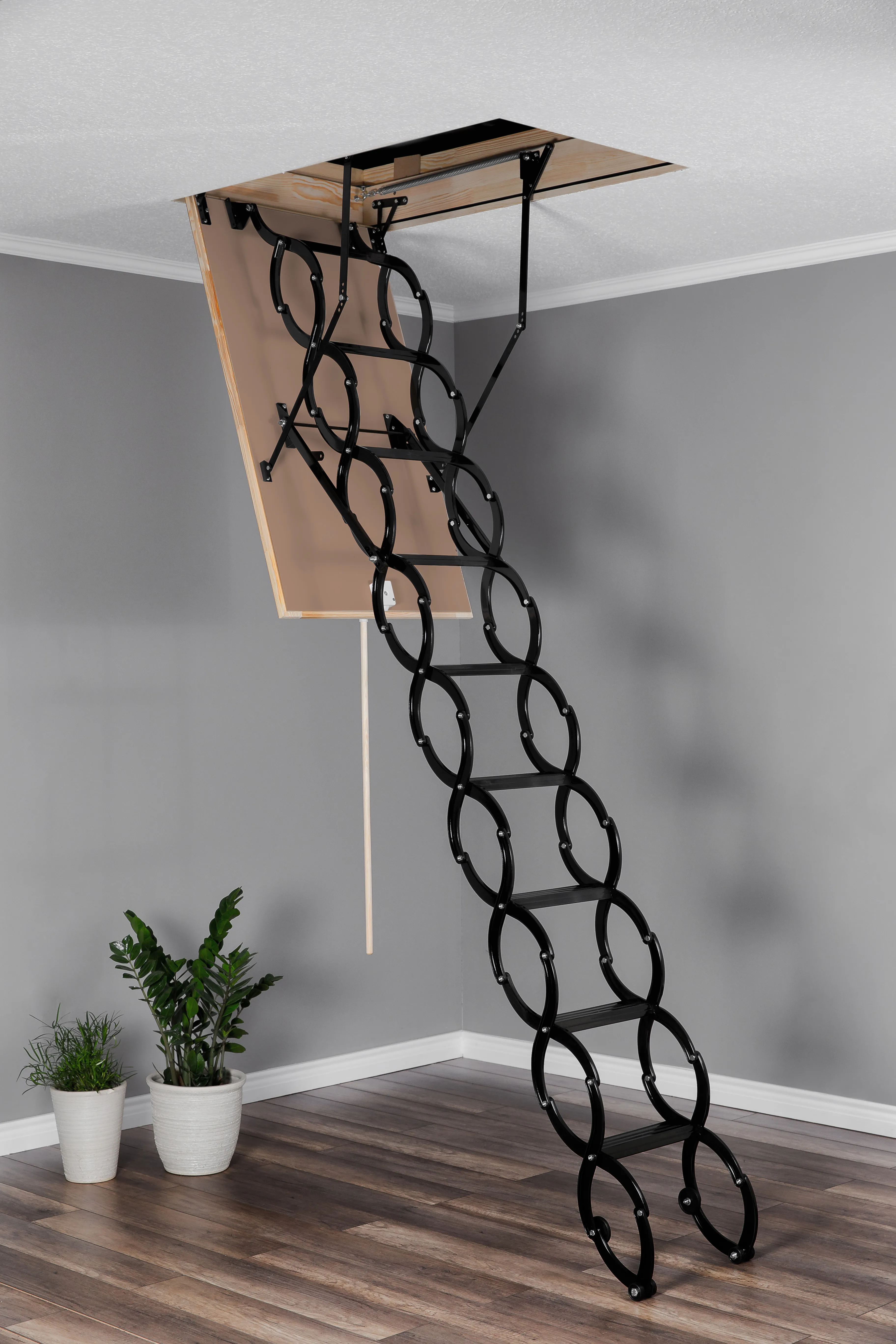 Благодаря «ножничной» системе складывания в сложенном виде лестница LSF очень компактна, и соответственно имеет небольшой размер крышки люка. Специальный механизм регулировки угла открывания крышки люка позволяет подогнать высоту лестницы под высоту потолка.