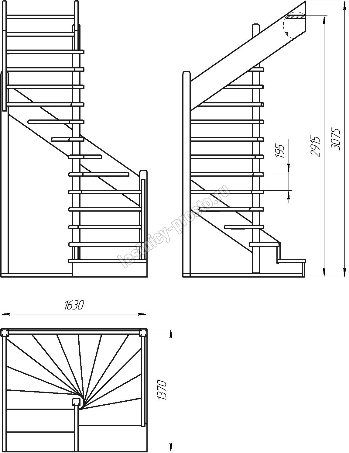Деревянная межэтажная лестница ЛЕС-01 2915-3075 проем 1630-1370, Бук