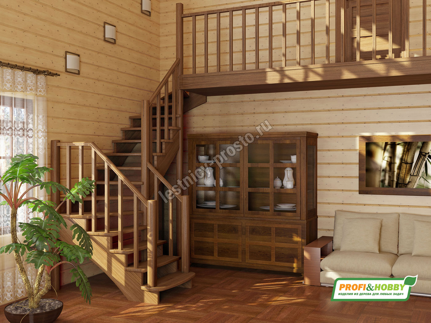 Ступени и поручень лестницы выполнены из бука, остальные элементы из сосны. Возможно изготовление данной модели полностью из бука.