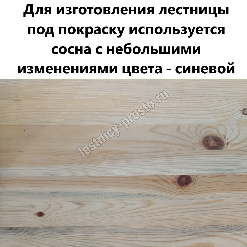 Для изготовления лестницы под покраску используется сосна с небольшими изменениями цвета - синевой, такой допустимый порок древесины существенно не влияет на ее механические свойства и практически незаметен при покраске в тёмные цвета.