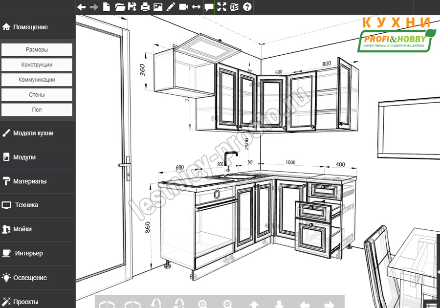 Благодаря модульной системе такая кухня может быть собрана зеркально, а, например, верхние шкафчики "под стекло" и "глухие" заменены местами. В стандартной комплектации нижние тумбы оснащены регулируемыми ножками высотой 100 мм и цоколем из массива сосны 95 мм.
