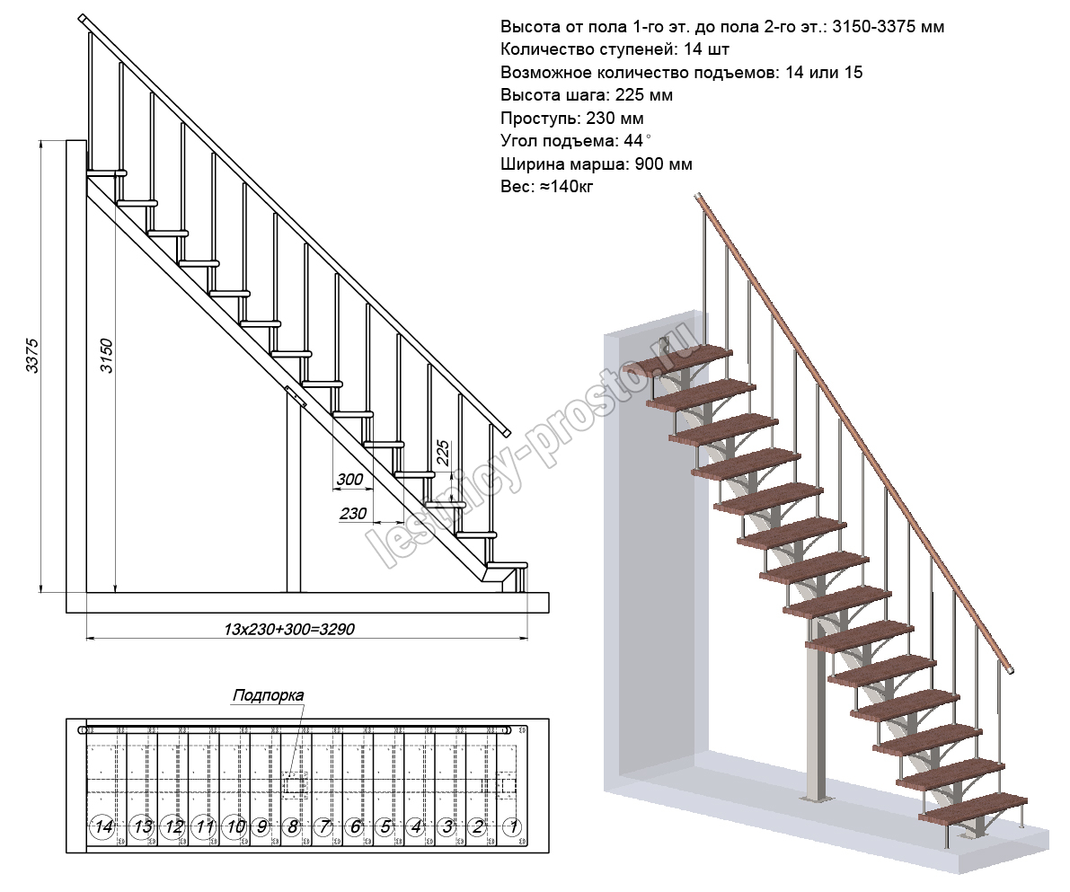 Лестница PROSTO MONO прямая, h337.5 см, ступени лиственница
