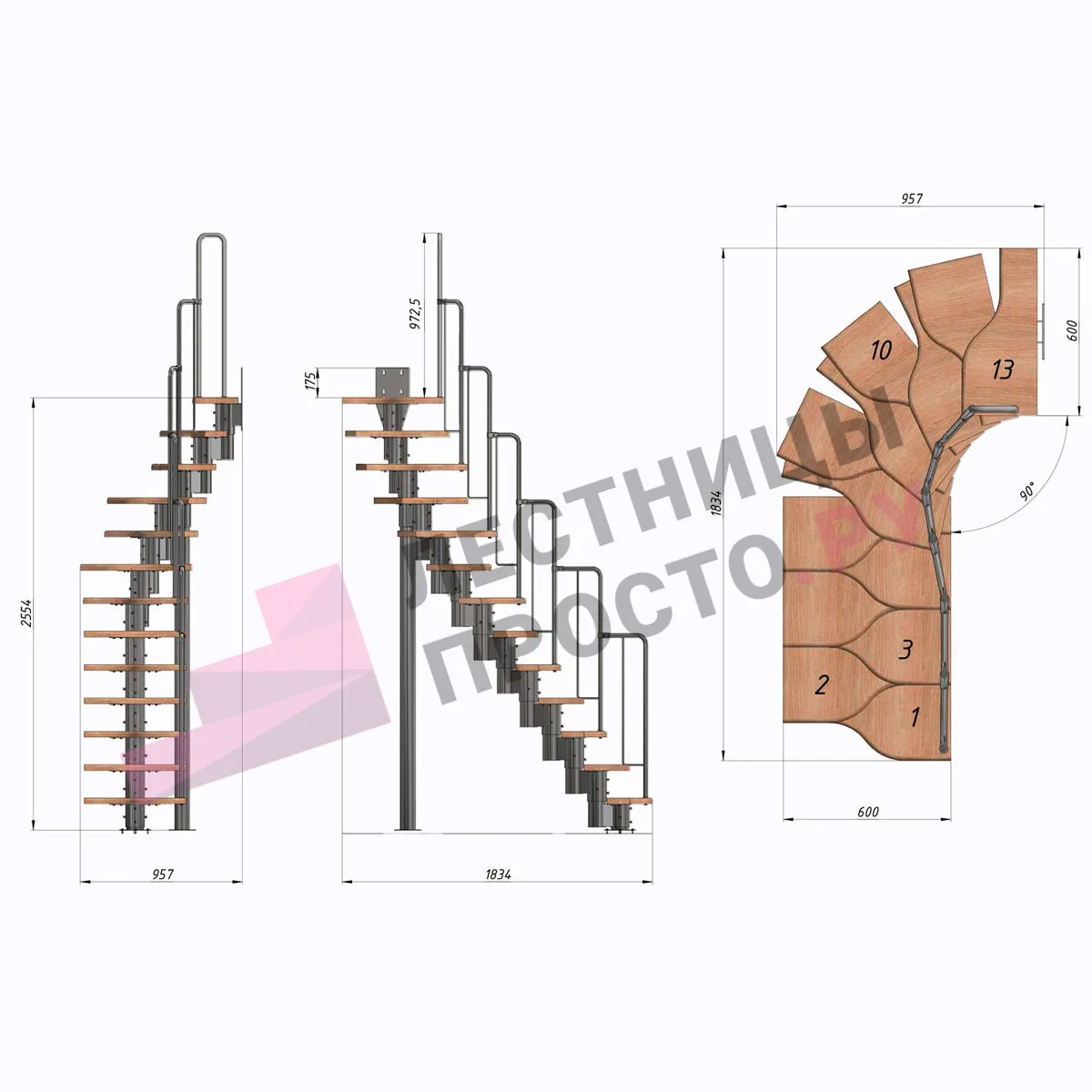 Лестница Prosto Urban Grey г-образная гусиный шаг 600 мм/ Ступени из берёзы мультиплекс