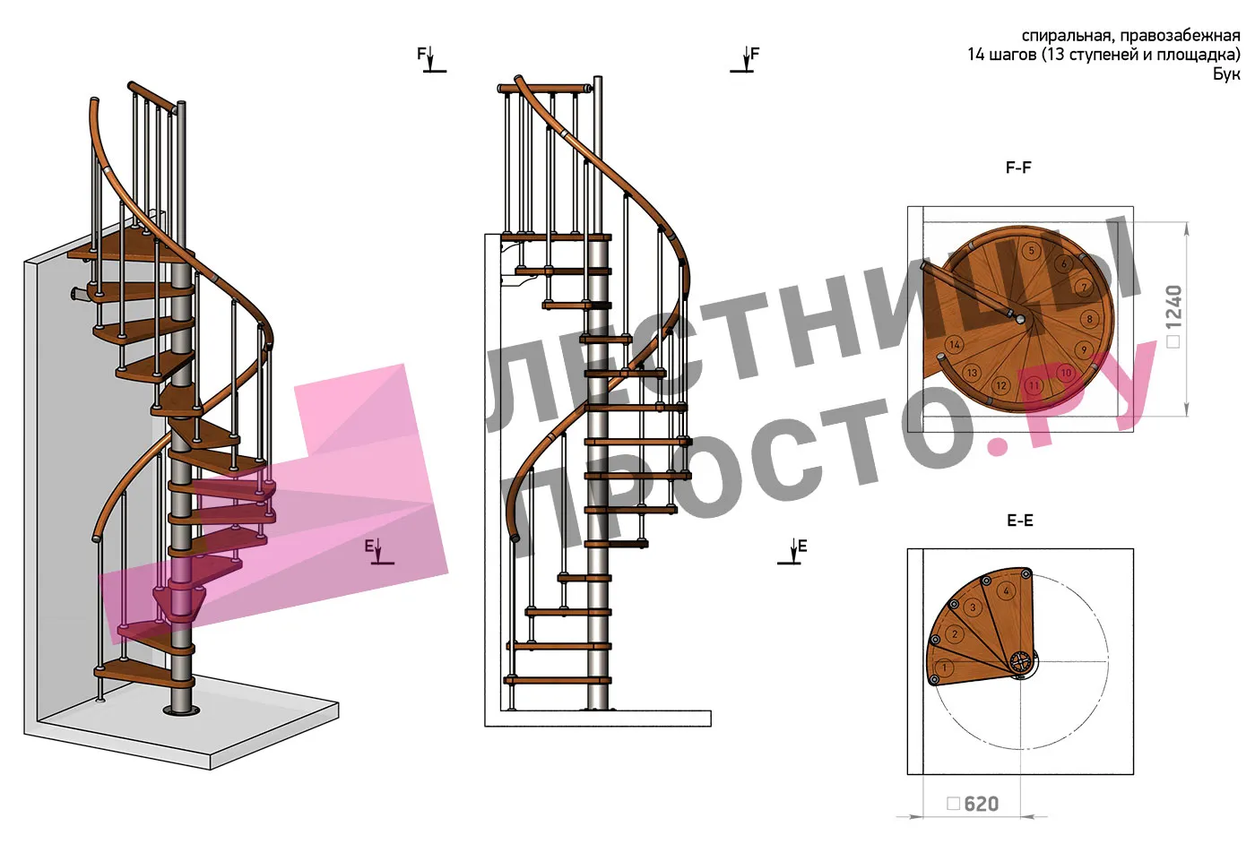 Правая, d=120см, 13 ступеней + площадка