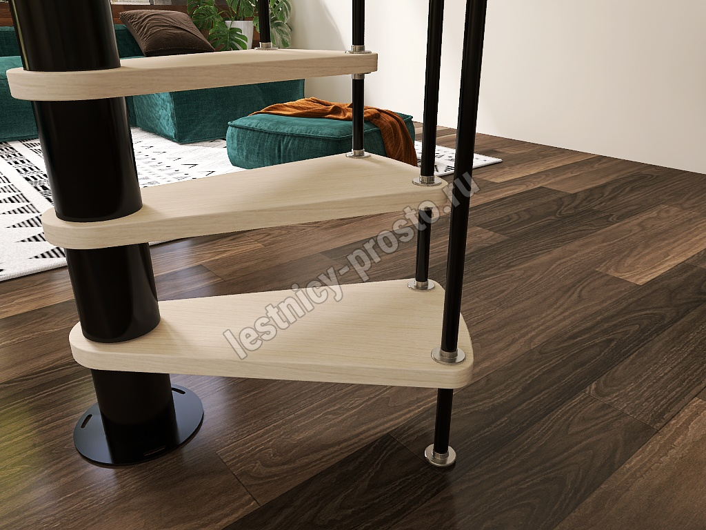 Экономит пространство. Высота ступеней регулируется с шагом 3 мм. в пределах 217-247 мм., благодаря чему, лестница прекрасно подгоняется под необходимую высоту.