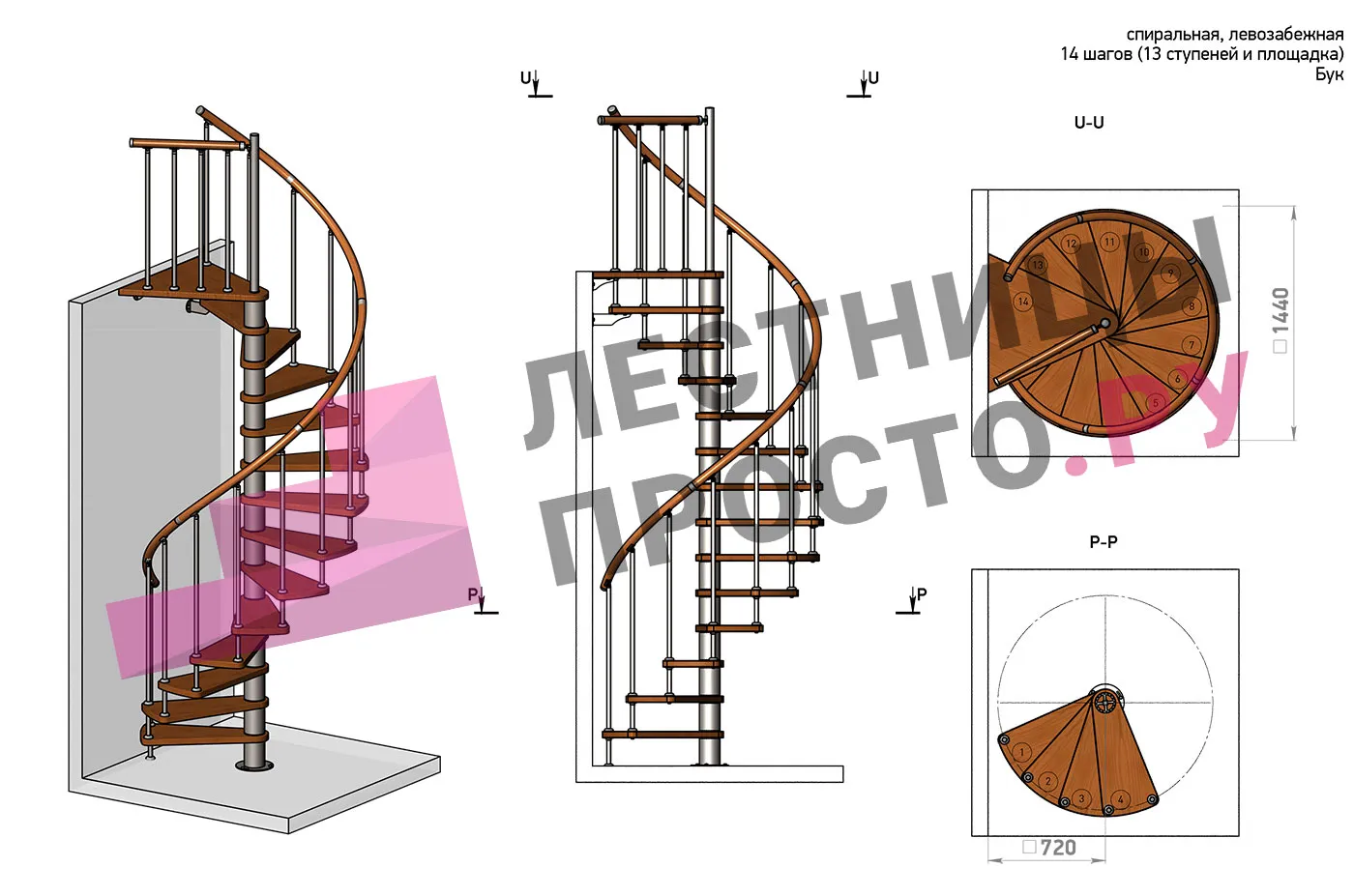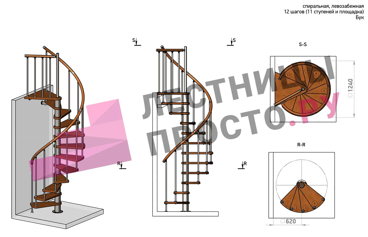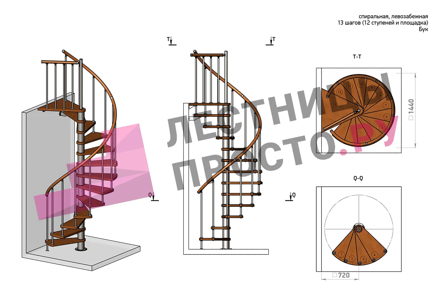 | Винтовая лестница Prosto Spiral White D140см, h282.2-326,3 см, бук |