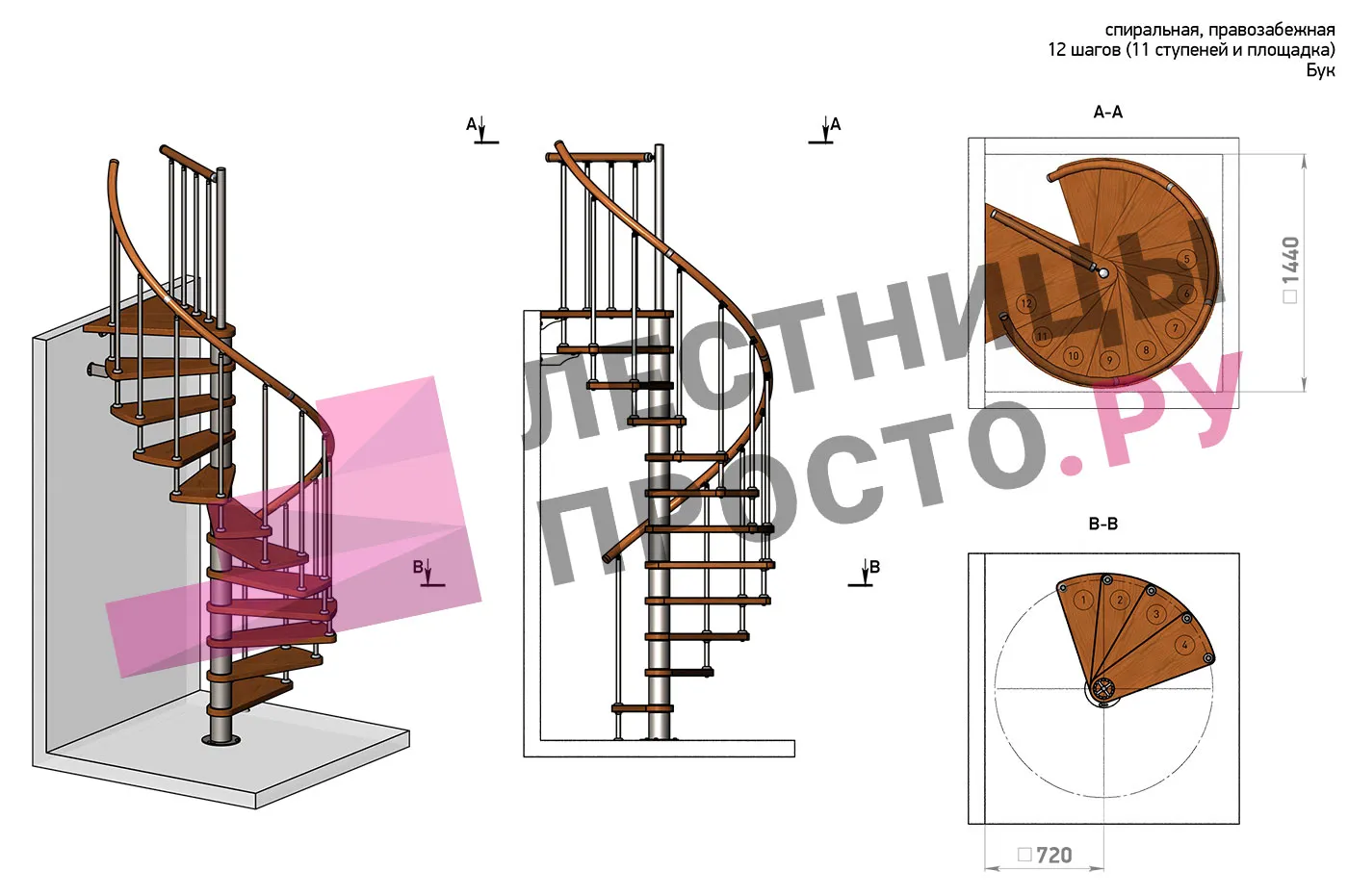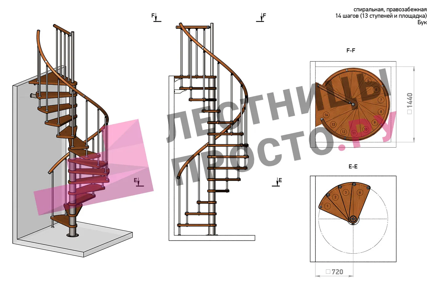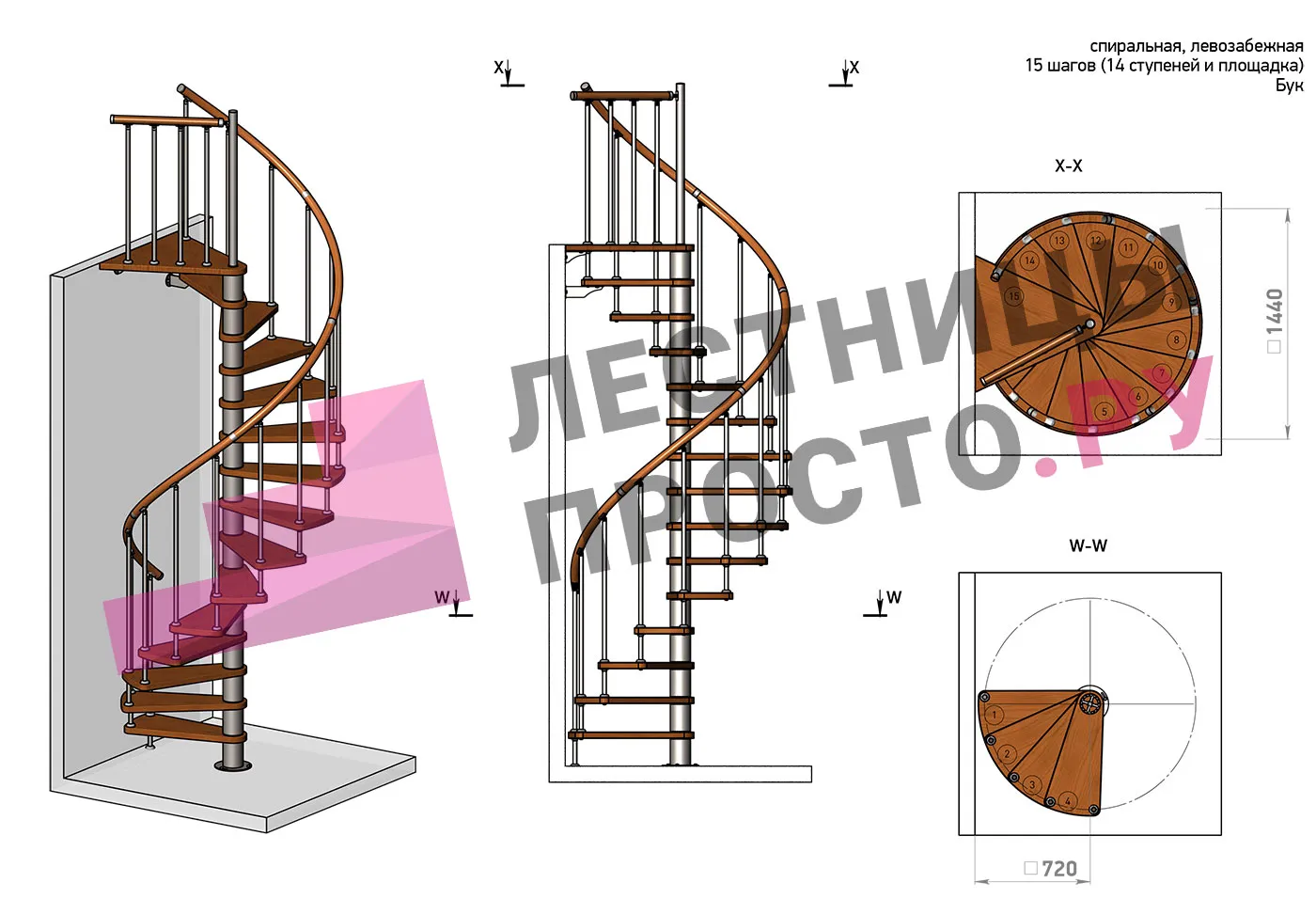 | Винтовая лестница Prosto Spiral White D140см, h282.2-326,3 см, бук |