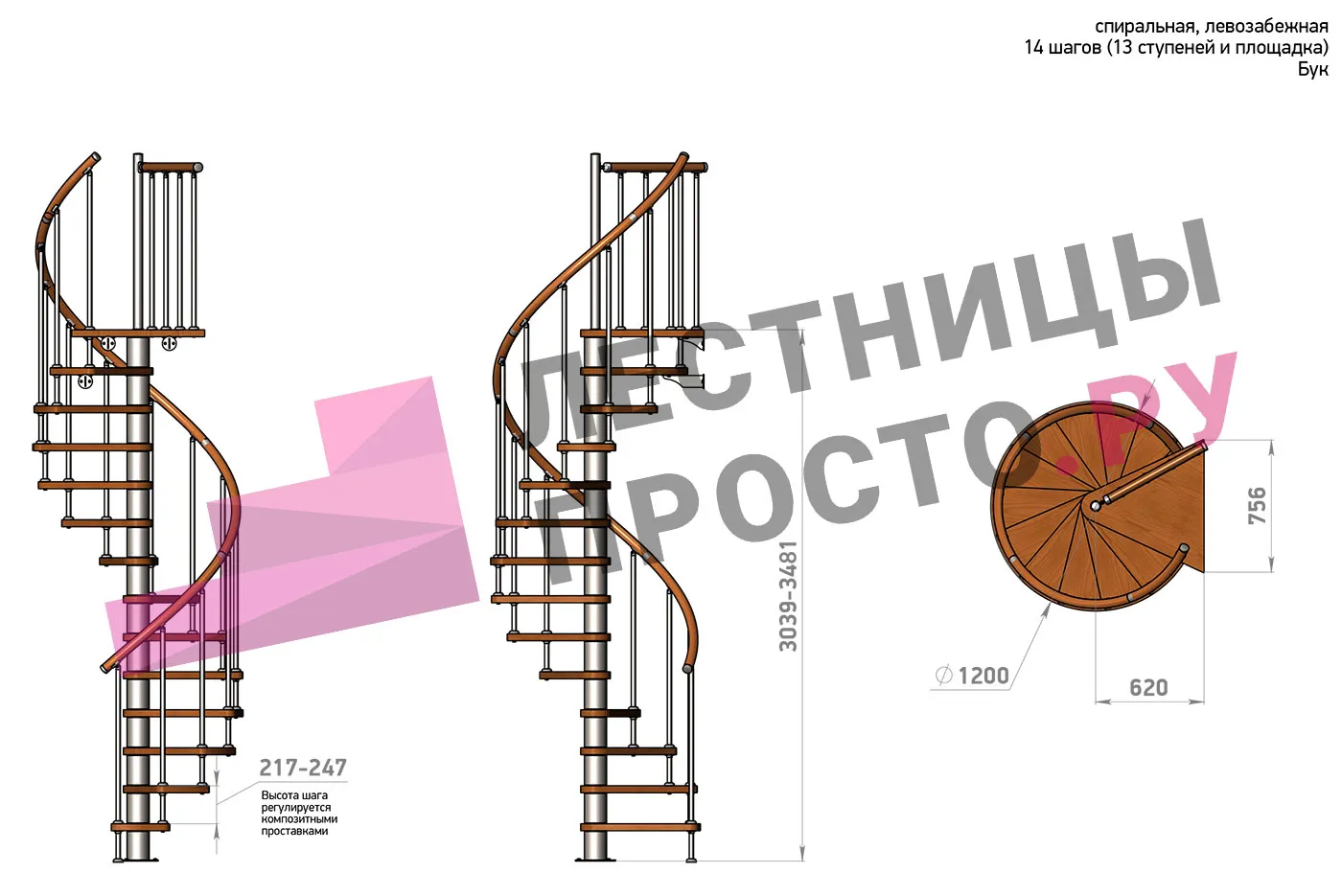 | Винтовая лестница Prosto Spiral White D140см, h260.5-304.6 см, бук |